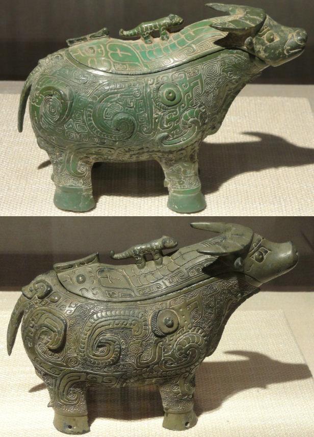 两件牛尊(有的地方也称牛觥),分别藏于衡阳市博物馆(上图,1977年衡阳市郊包家台子出土)和上海市博物馆(下图,征集,出土地点不详),乍一看非常相似,但仔细分别却又有诸多不同,比如颜色、鼻子、足、尾、臀部花纹等