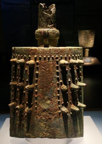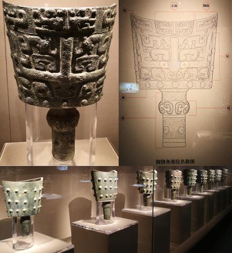 铙是长沙出土商代青铜器中最具特色的器物,长沙也是出土铜铙最多的地区。铜铙始见于商代,是中国最早的金属乐器之一,有中空的短柄,插木可执,以槌击鸣。《周礼.地官.鼓人》记载“以金铙止鼓”,就是说,军队打仗时,击鼓进军,鸣铙则停止击鼓,表示退兵。周以后成为重要的礼乐器,逐渐演变为钟。有的有枚,有的无枚。枚就是乳状的突起,是加速钟音衰减的一种振动负载,具有消耗振动能量的作用,因而可以节制余音,改善钟声。
