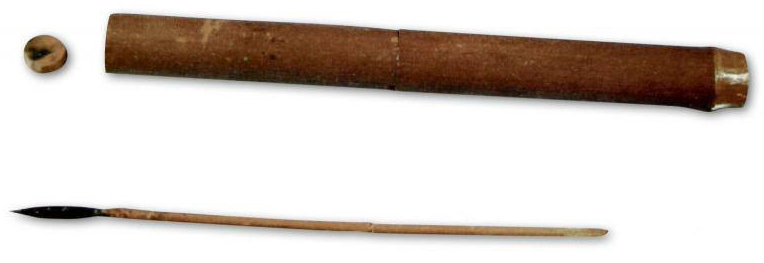毛笔,1954年,在长沙左家公山的战国楚墓中出土了一支完整的毛笔,也是目前最早的有实物证据的毛笔。笔管长18.5cm,笔毛长约2.5cm和笔身都套在一节小竹管中,起到保护的作用。笔毛是质地很好的兔箭毛,就是山兔背上一小撮弹性强、锋颖最好的毛,尖锐且刚劲。现在的毛笔中,用兔颖制作的称为“紫毫”,造价较高(出锋3cm,价格100元)。