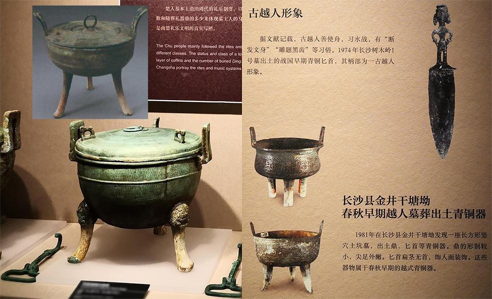 越式鼎造型一般形体较小,多数垂腹、细足,附环耳或梯形耳。多饰绹索纹、蟠虺纹等,与中原鼎、楚式鼎都不同,极具地方特色。左图中,鼎的两旁还有配套使用的鼎钩。右侧战国早期青铜匕首上的古越人高鼻、大眼,头顶有圆形发结,一发辫垂至肩部,双耳系粗大耳坠,胸部裸露,双手置于腰下,双足并立,赤足,手腕处有手镯,腰间系一短裙,上饰“人”字形和条形图案。