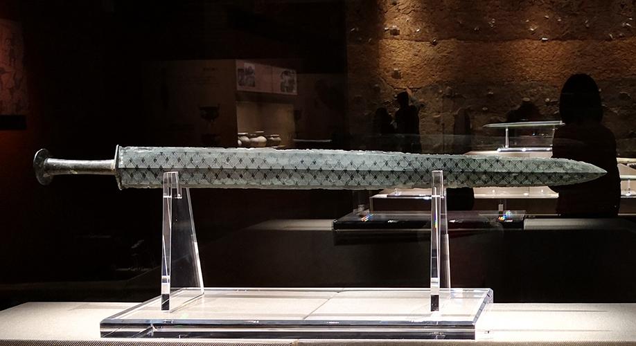 这件战国菱形纹铜剑揭示了我国早在2500年前就已掌握金属膏剂涂层工艺,也就是表面合金技术。把某一种金属做成象牙膏一样膏剂,然后用这种膏剂在剑体上画出所需要的花纹,一般是白色。涂了以后,它会在剑体上扩散,没有涂到的部分是青铜的本色。再把剑浸泡在腐殖酸的水溶液当中,随着时间的推迟,颜色慢慢慢慢就变了,有膏剂的地方慢慢变成灰色、黑色,而且会生成一种釉质,显得剑身很亮。