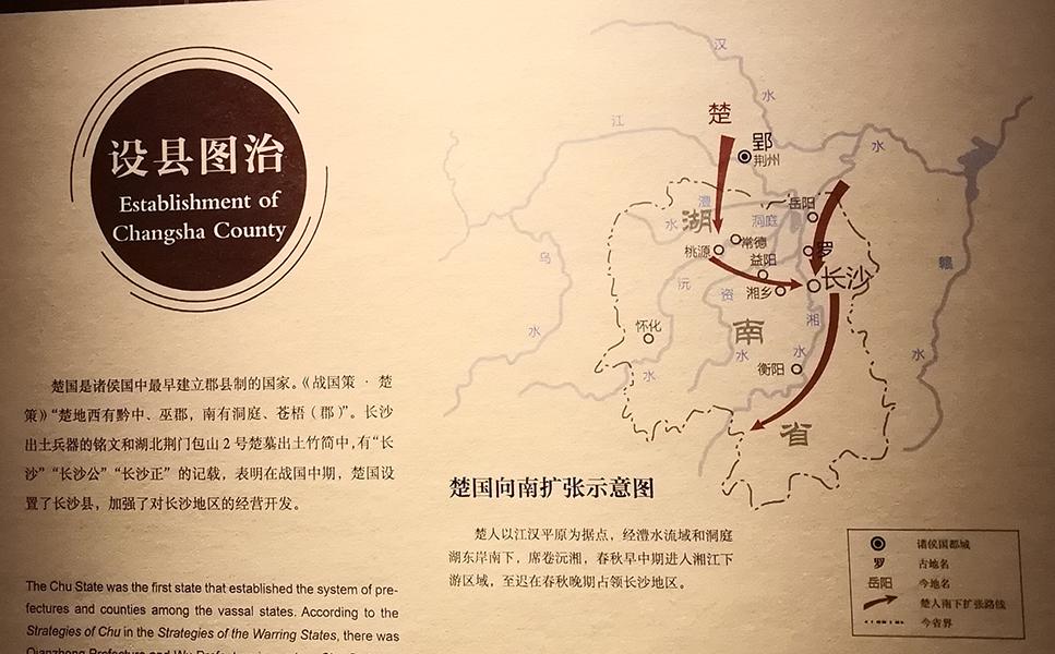 春秋晚期,楚人来到长沙。由于长沙战略位置重要,长沙成为楚国往南拓展的重要据点。楚人在这里设县筑城,厉兵秣马,使长沙成为了楚国南部的军事重镇。