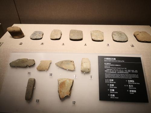 石器有石斧、石凿、石磷、石镰等,分别以燧石、页岩、卵石经过磨制和多次加工而成。类型分明,器形完整。比如石凿多用长条形卵石将一端磨成刃口。石锛,上端绑木柄的部分呈现明显阶梯状的两节,也称“有段石锛”。石镰为横写的一字形,一端磨尖,另一端磨出两道缺口,类似“双肩”,以绑扎镰柄,通常称为“有肩石器”。