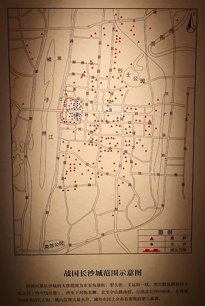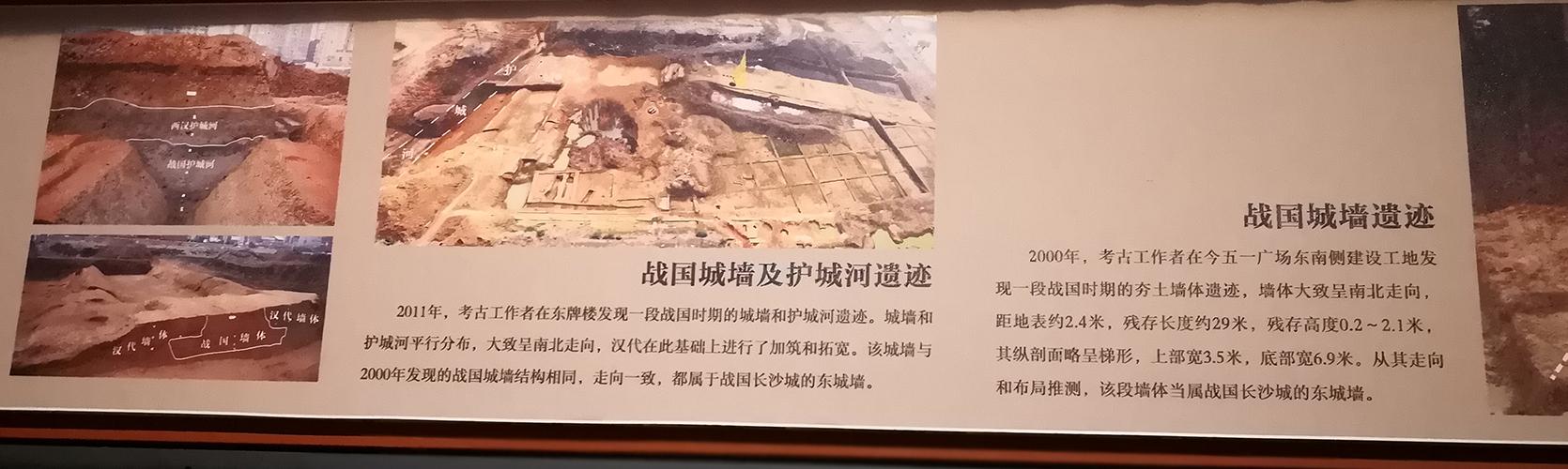 五一广场长沙古城地层剖面,从下至上依次为战国、两汉、魏晋、隋唐、宋元、明清及近代文化层等。这也表明,五一广场周边从战国以来一直是人口稠密的城市中心,虽然历经两千余年,长沙的城市规模不断地壮大和扩展,城市中心却不曾变更,这是中国乃至世界城市发展史上的一大奇迹。明代这一层看不到什么遗留的生活物品,是因为1478年修缮吉王府,在长沙城内修王府城墙,五一广场正好处于吉王府的范围。(1个世纪前,1372年,长沙守御指挥使邱广就在长沙城外修筑城墙,如果取那里的地层剖面,也看不到。因为筑墙时,要把地重新挖开,再夯筑泥土。)还有一层近代的,土质焦黑,这是当年文夕大火造成的。