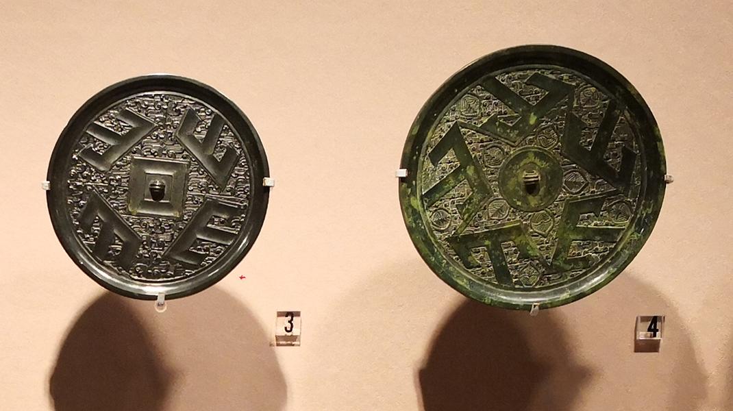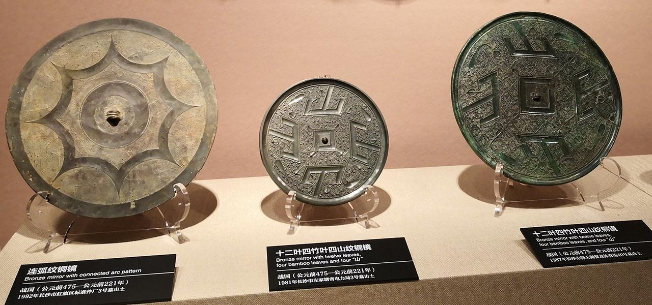 生产力飞跃的另一个体现是手工业也开始发展起来,长沙成为楚国制造业的中心,这里陈列的铜镜、玉器、琉璃器、漆木器都是当时的代表性器物。战国是中国铜镜发展史上的第一个高峰期,长沙是楚国的铜镜铸造中心。楚式镜以铸工精巧、质地轻薄而著称。其中最为流行是山字镜,四山镜出土得最多,我们现在看到的战国草叶纹五山字镜是其中罕有的珍品,到目前为止,经考古发掘出土的五山镜仅有4枚。