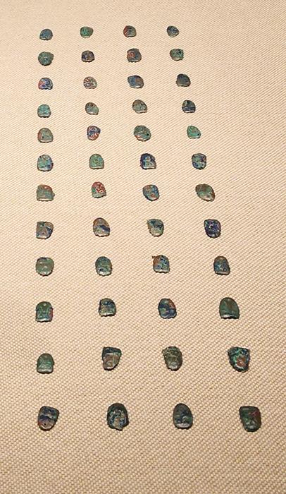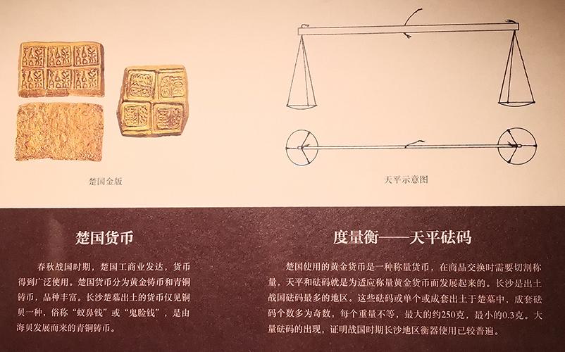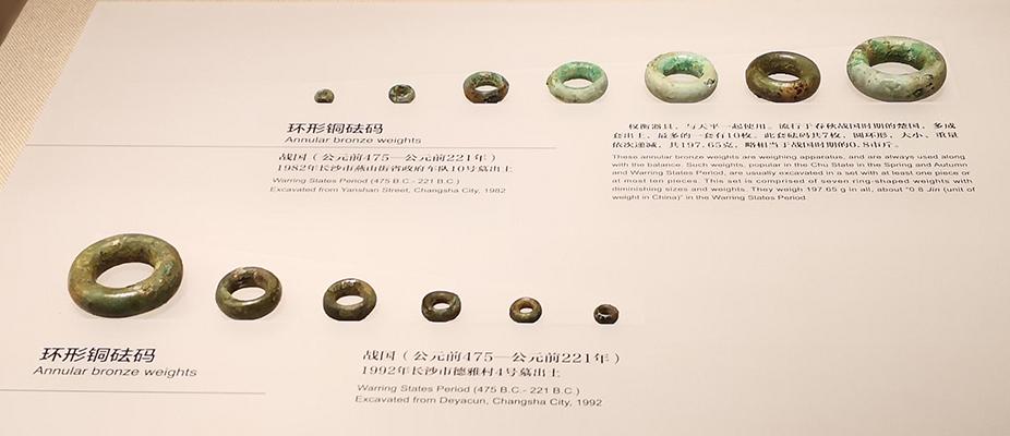 另外,楚国在大宗商品交换时,需要使用切割成不同大小的黄金货币 “郢yǐng称”,天平和砝码就是称量货币的衡器。长沙是出土战国时期砝码最多的地区。砝码个数不等,最少的1个,最多的10个。成组砝码中每个重量不等,最大的约250克,最小的0.3克,10个一组的砝码总重量约500克。大量衡器的出现,体现了战国时期长沙地区工商业贸易的繁荣。