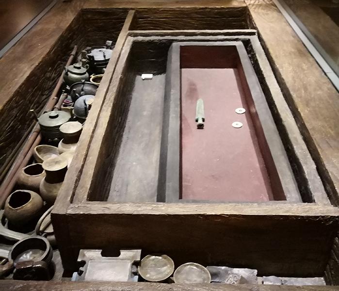 这里复原的浏城桥一号墓,是长沙市区发现的规模最大的楚墓。同时,墓中出土的兵器达93件之多,占出土文物的三分之一,还有车马器陪葬,推测墓主人是一位领兵作战的将军。