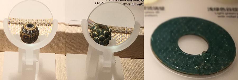 蜻蜓眼琉璃珠和深绿色谷纹琉璃璧(右)
