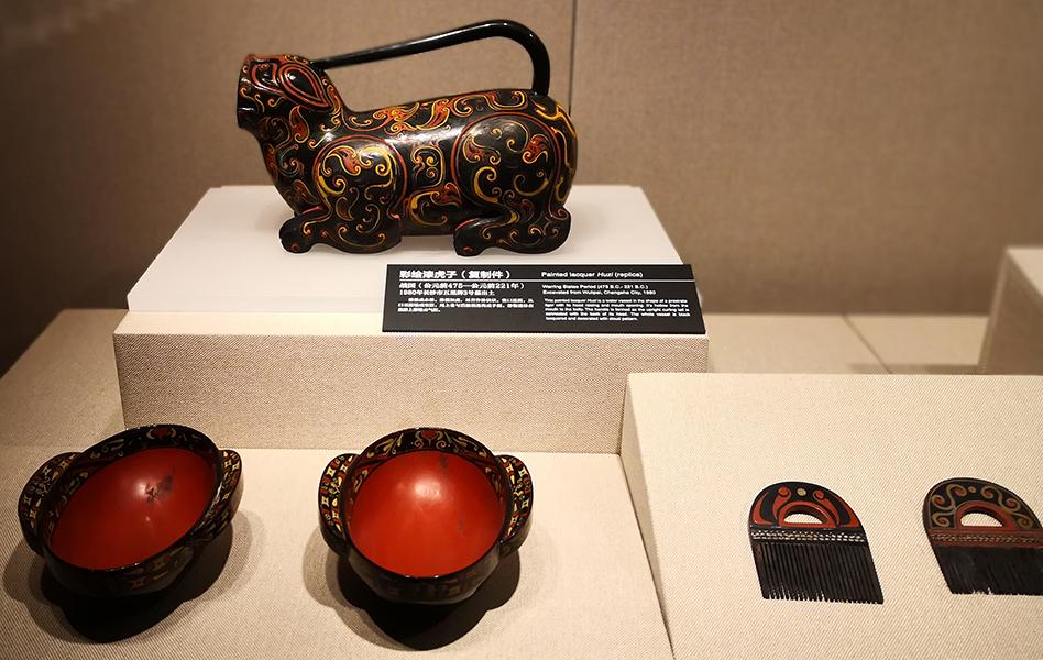 战国也是中国漆器发展史上的第一个高峰期。楚国的髹漆业在各国中最为发达的,先秦漆器以楚墓出土得最多。漆器多为王侯贵族所使用。其中更为有意趣的这件漆虎子,为溺(音“尿”)器或水器,其用整木雕成,形状似虎,尾反卷至头部形成提梁。器身线条流畅,形态生动,是国内所见最早的虎子之一。