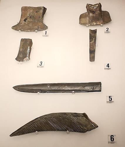 1、铜斧;2、铜铲;3、铜锛;4、铜凿;5、“王”字铜鐁;6、铜镰