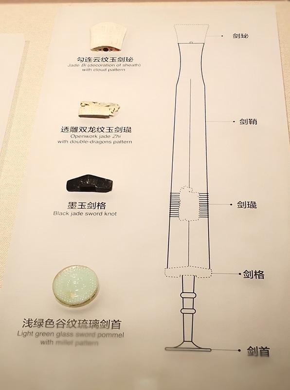 先秦一部有名的书叫《荀子》,里面有一篇叫强国,谈到青铜剑的制作。制作精良的剑,第一要刑范正,就是浇铸青铜剑的模子要正,用的铜和锡要纯,否则浇铸的时候会有气泡,剑身上就会留孔。第二要工冶巧,就是技术要先进。第三要火齐得,就是火候要掌握的非常到位。而吴越之剑更加优秀,它要求剑一定要有剑首、剑柄(也叫剑茎)、剑格、剑脊、剑刃、剑锋这样一些要素。剑首和剑格部分除了防止手滑(剑首防剑脱手,剑格防手滑到剑锋上)之外,还起到装饰作用,很多宝剑都在这里镶嵌宝石。众所周知的“越王勾践剑”有一个独到之处。它的剑首由11圈直径0.2毫米左右的同心圆铜片组成,间隔0.3到1毫米。现在称为“薄壁同心圆”,具体怎么做的,还有争议。吴越之剑还有一项技术是中国独有的,那就是“双色剑”。剑身部分的脊和刃是分开制作再浇铸成一体,这需要克服许多困难。