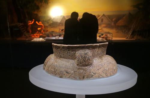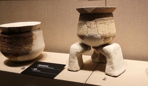 大塘文化中常见的一种炊器,主要用于烹饪食物和烧水。这三个支座保存完好,向我们展示了陶釜的使用方法,支座将陶釜支撑起来,底部空间则用以生火烹饪食物,是陶鼎的雏形。