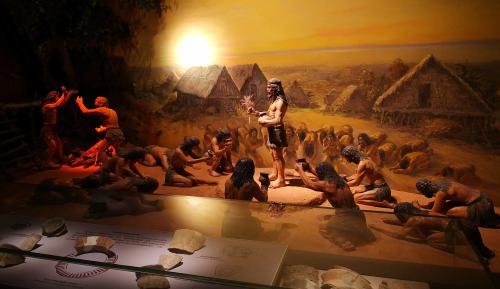 旧石器时代经历了漫长的岁月,到了距今约1万年前,人类从山区走向平原。打制石器越来越精细,开始出现磨制石器,劳动工具的种类和数量都大大增加,渐渐有了农业和畜牧业。在湖南道县寿雁镇的玉蟾岩,考古研究所的专家发现了距今约1.4~2.1万年前的遗址,文化堆积厚1.2-1.8米,有大量打制石器和非常粗糙的陶器、骨器、角器等,还有中国目前已知的最早的稻种。说明人类在那里生活了很长很长的时间,从旧石器时代过渡到了新石器时代。