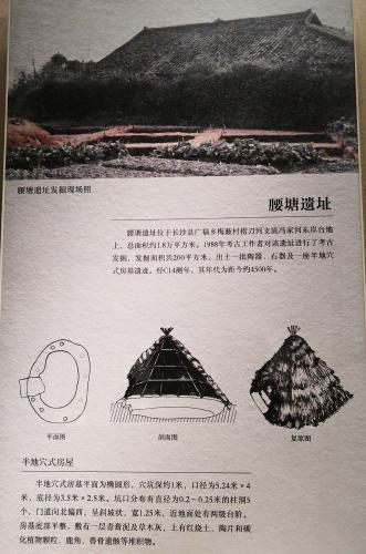 位于长沙县冯家河东岸的腰塘遗址,距今约4500年。考古工作者出土了一批陶器、石器以及一座半地穴式房基遗迹。房基面积为16平方米,穴坑深约1米,门道呈斜坡状,近地面处有二级台阶。房基底部平整,地面上有陶片、碳化植物颗粒、鹿角等堆积物。