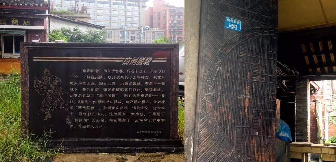 韩玄慌不择路,向天心阁后方的“磨盘湾”逃跑。跑出巷口,韩玄发现前方有两条路。情急之中,韩玄想出一个绝妙的好招儿来迷惑魏延。他将自己一只脚上的靴子脱下,将靴尖朝南放置,光着一只脚往城北方向逃跑。魏延追到巷口,不见韩玄踪影,只见地上躺着一只靴子,聪明的魏延立刻明白了这是韩玄有意使的诡计,便不予理睬继续向北追去,这条小巷后来被命名为“南倒脱靴”。