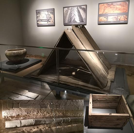 芙蓉区东牌楼街原址搬迁过来的房基遗址,包括陶制的排水管道、涵渠。涵渠是较大的排水设施,它在挖好的沟渠上加盖三角形的模板,防止泥土下陷后,土块或杂物落入,堵塞沟渠。