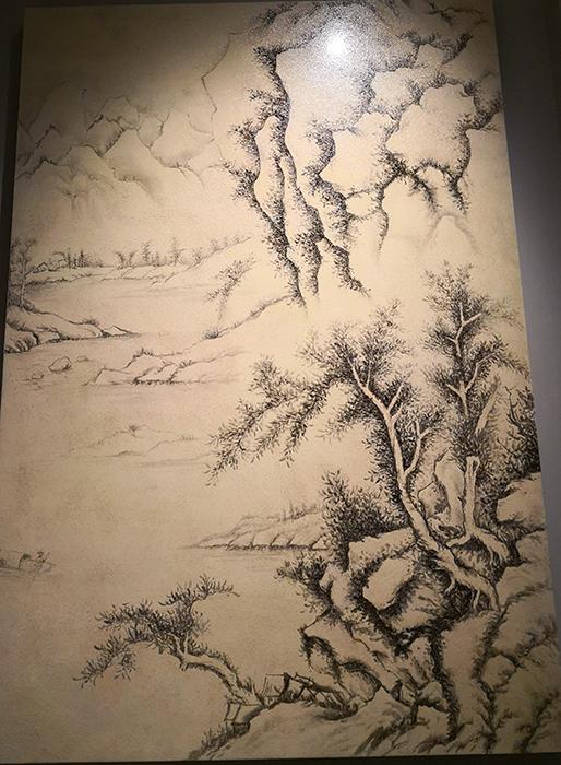 这八副木雕版画,展示的就是诗中所提及的“潇湘八景”,为湖南风景之冠,为历代文人学士所称颂。其中江天暮雪描绘的就是橘子洲白雪江天浑然一色的美景。