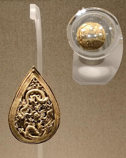 元镂空龙纹心形霞帔金坠(左)“长命富贵”金钱(右)