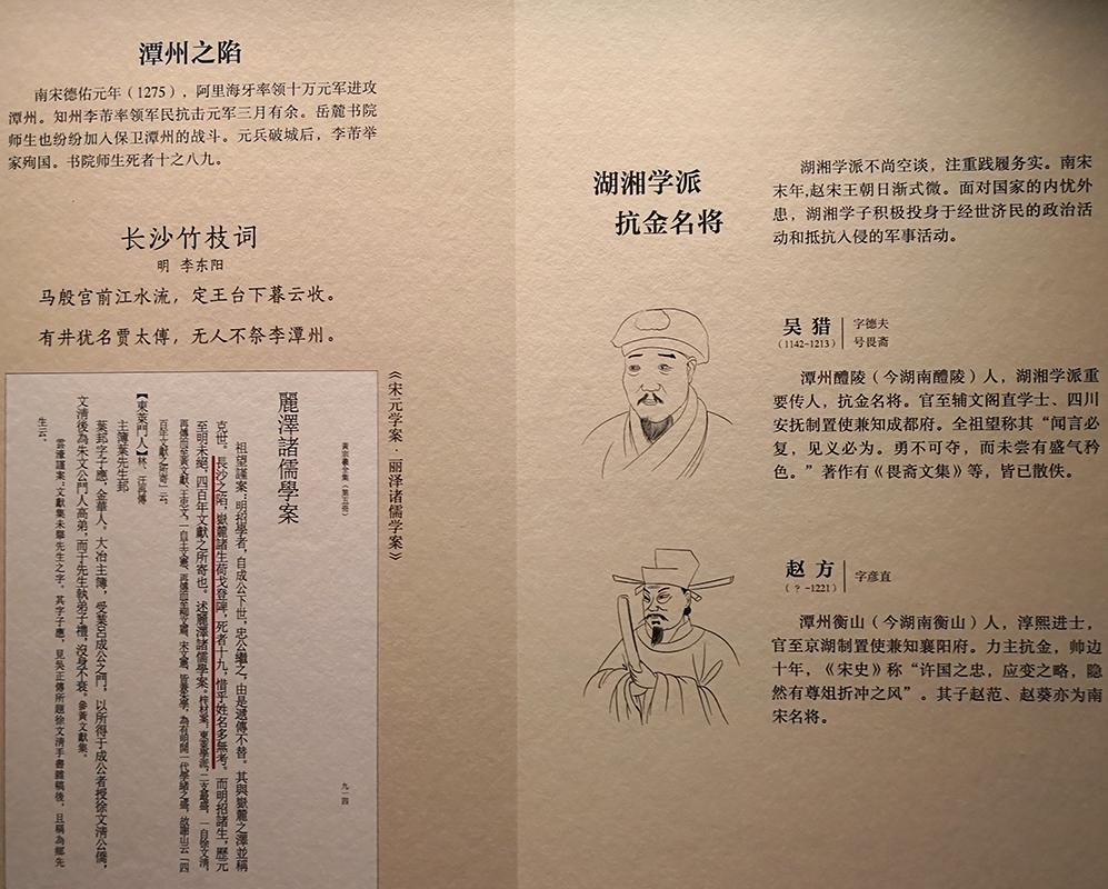 南宋初湖湘学派的开创者胡安国和他的二儿子胡宏到湖南隐居,创办碧泉书院。张栻为抗金名将张浚之子,二十九岁时拜胡宏为师,主教岳麓书院七年,从学者达数千人,使湖湘学派成为南宋理学大宗,后代学者将其著作合辑为《南轩全集》。他与朱熹讲学论道达两月之久,后世学者称为“朱张会讲”,使湖湘学派理学思想更加趋于成熟,影响湖湘文化数百年发展。