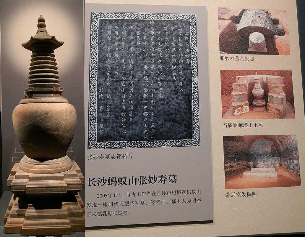 喇嘛塔又称藏式塔或覆钵式塔,是藏传佛教的特色建筑样式,这种塔在元代开始流行,明清时期继续发展,和喇嘛教在当时的盛行有关。覆钵内部中空,里面有一件木质经箱,内置数十册用金粉书写的道经及佛经,这一特殊现象在目前的考古发掘中比较罕见,是当时佛道合流思想的具体体现。