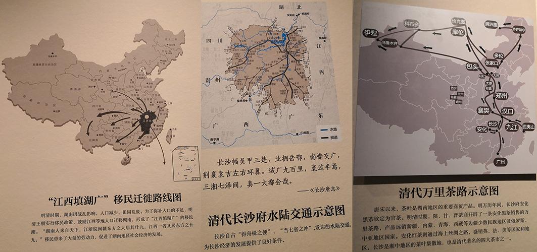 明代“江西填湖广”迁徙路线图(左)清代长沙府水陆交通示意图(中)清代万里茶路示意图(右)